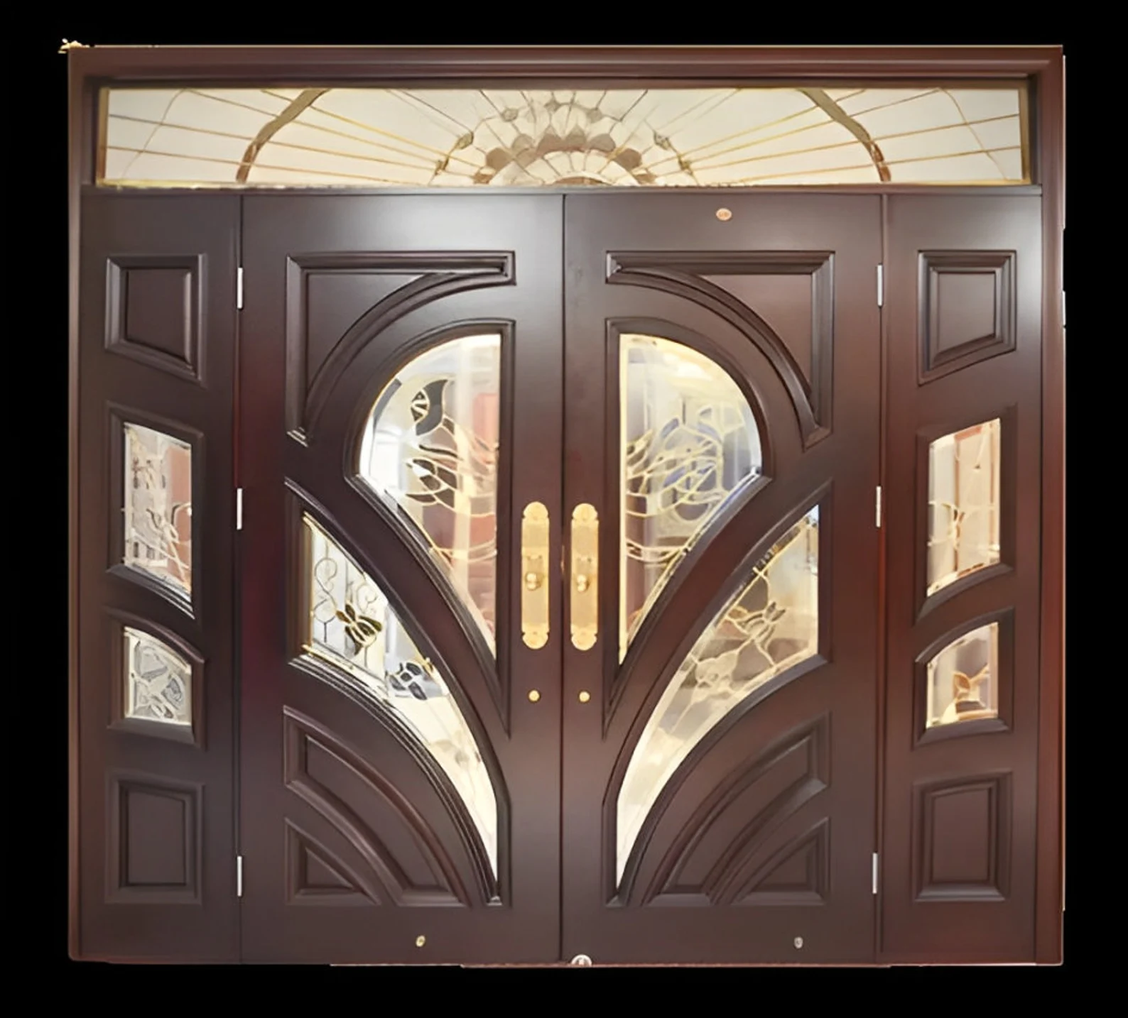 Custom made double door with sidelights and and transom. You can pick the type of glass as well with custom dimensions. Everything is custom to your liking.