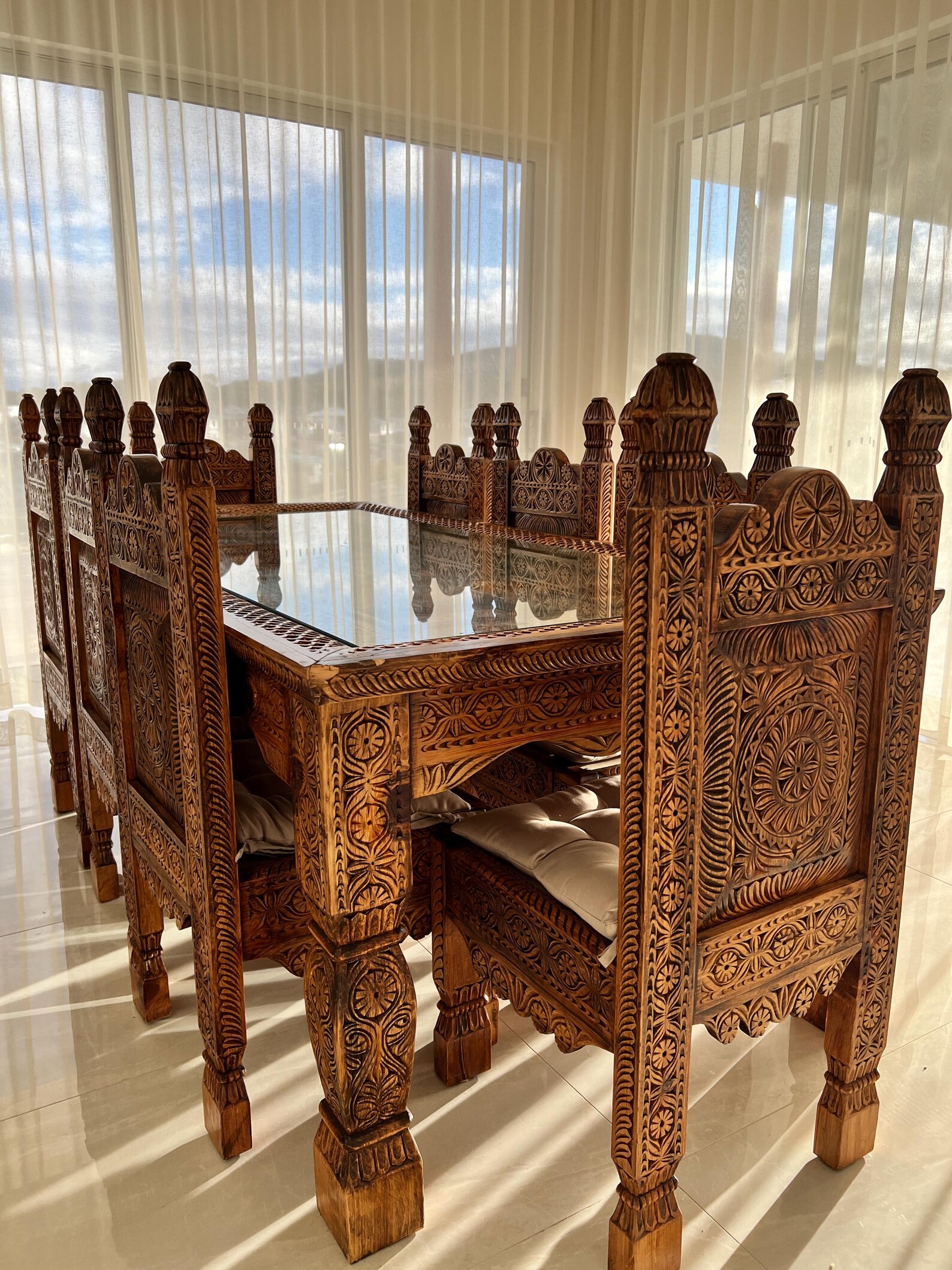 This stunning Royal beautiful sample piece of wooden custom handmade table with glass, comes with a nature woodish look is now available at our showroom in Canberra for display.